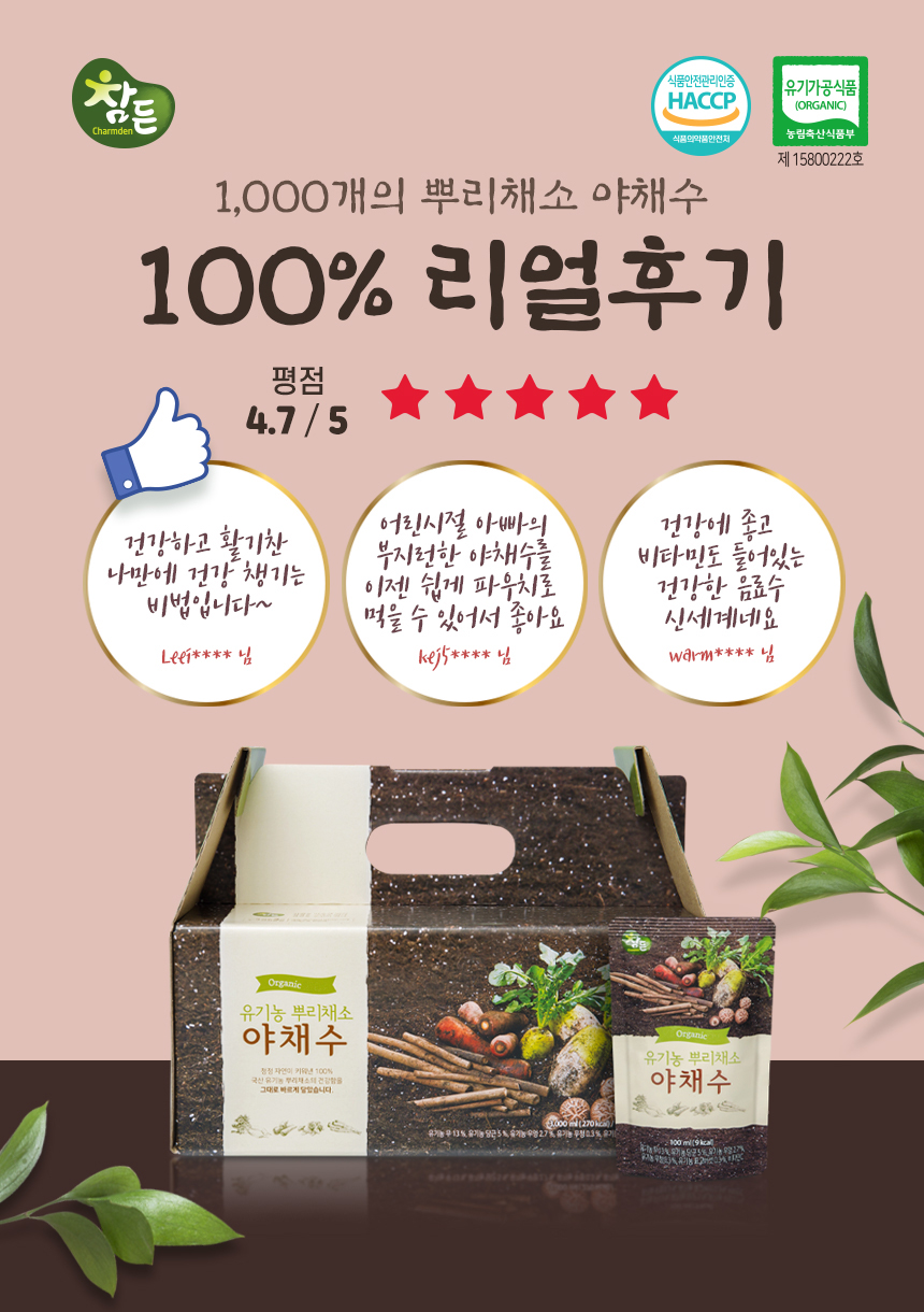 참댕유기채소수는 유기농 땅에서 자란 유기농 원재료를 계약재배하여 출시된 유기농 제품으로 안심하고 먹을 수 있는 제품입니다!